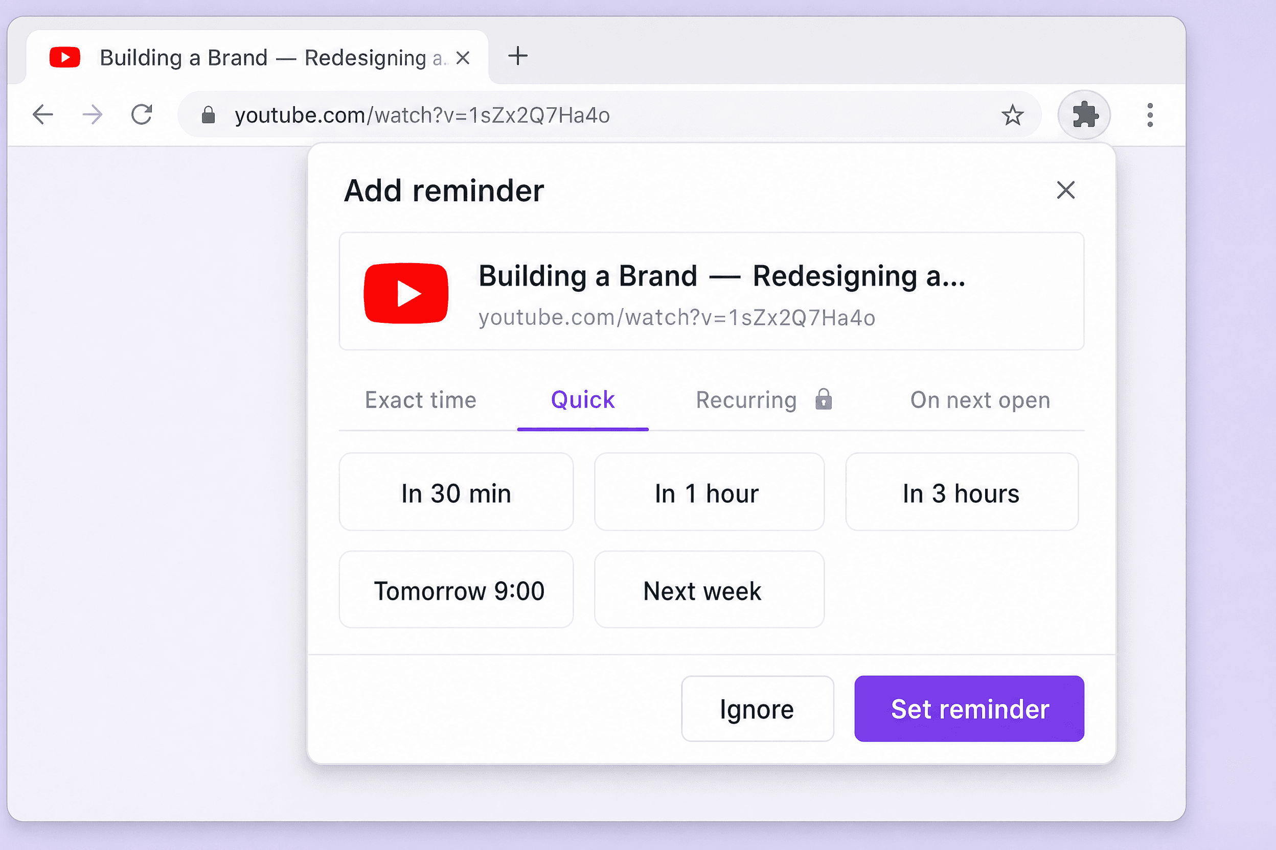 • Exact time, recurring (daily, weekly, monthly, weekdays…), or "next time you open Chrome".