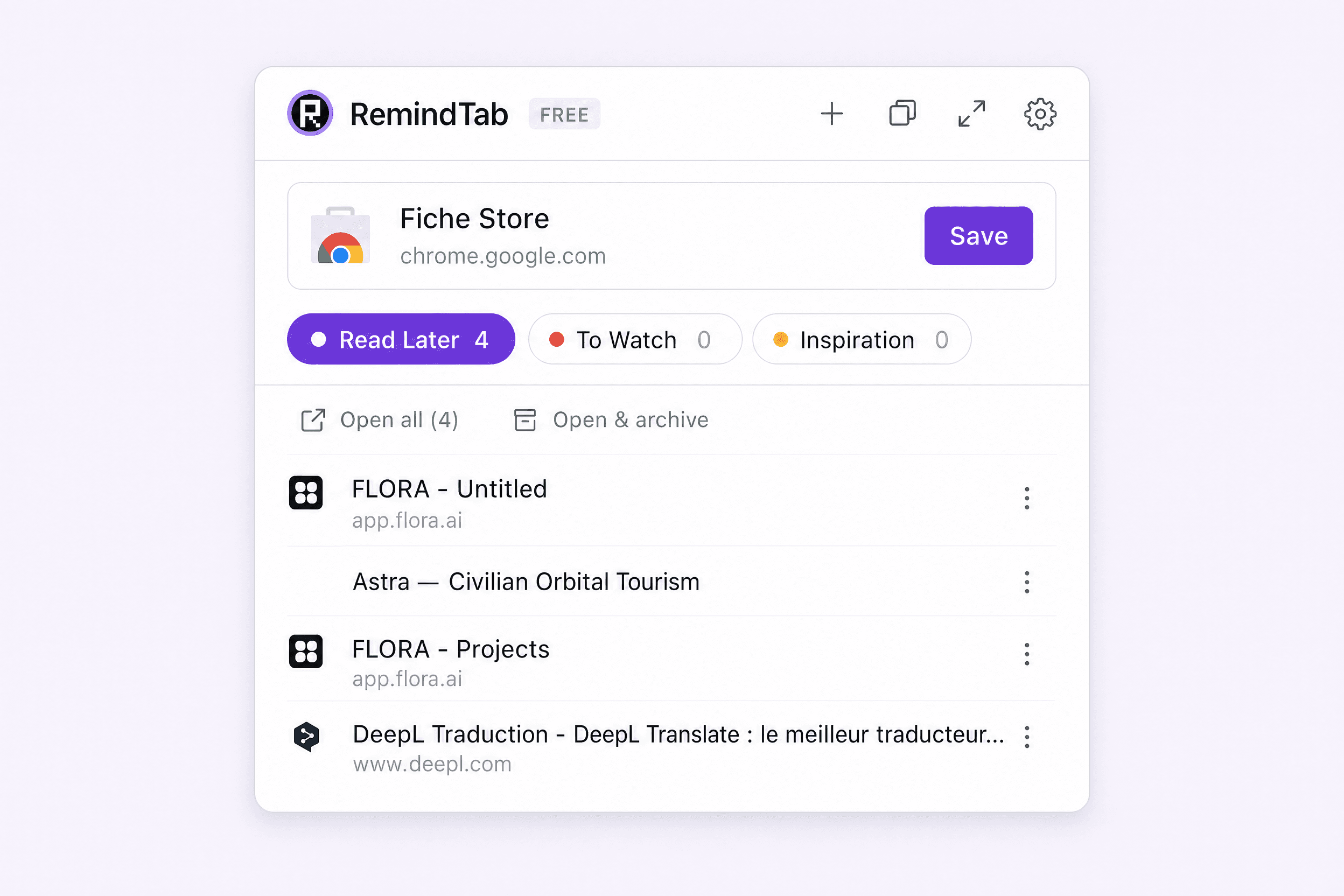 • Click the RemindTab icon → "Save current tab" and you're done.